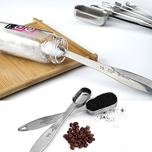 - Make mounthwatering desserts and dishes: making delicious lemon cupcakes, apple pies, pizza and cookies requires accurate and various measurements, so 1Easylife measuring spoons offer the variety you need 6 pieces: 1/8-tsp (0.63ml), 1/4-tsp (1.25ml), 1/2-tsp (2.5ml), 1-tsp (5ml), 1/2-Tbsp (7.5ml) and 1-Tbsp (15ml). Plus, these spoons are deep enough to accurately measure liquid and dry ingredients without spilling out