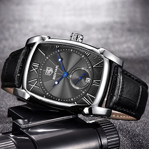 QUALITY LEATHER BAND AND CLASSIC RECTANGLE DESIGN : Scratch Proof Mineral Glass, Genuine Leather Band, Special Blue Pointer and Classic Rectangle Case Design, Bring You Luxury and Fashion Feeling.