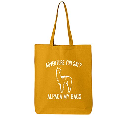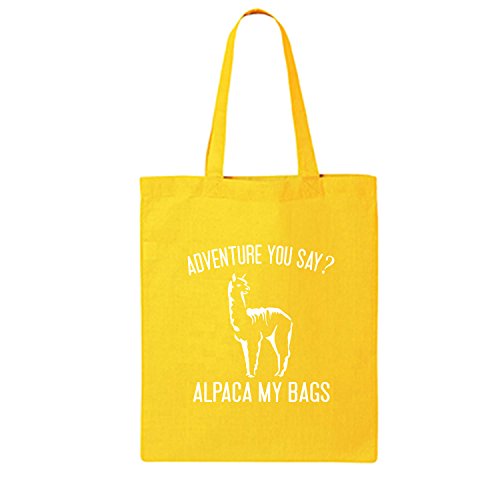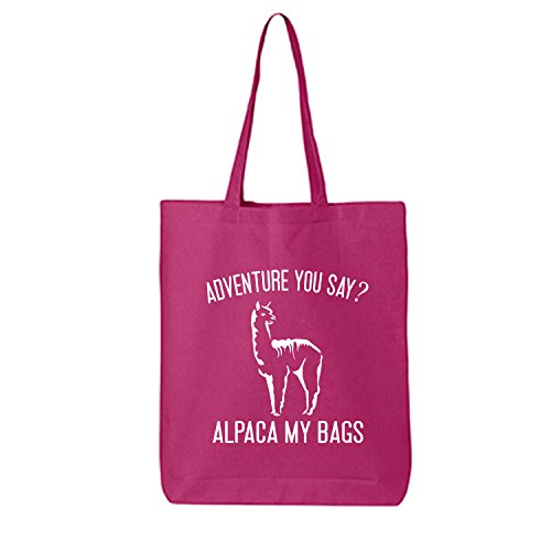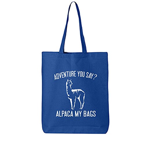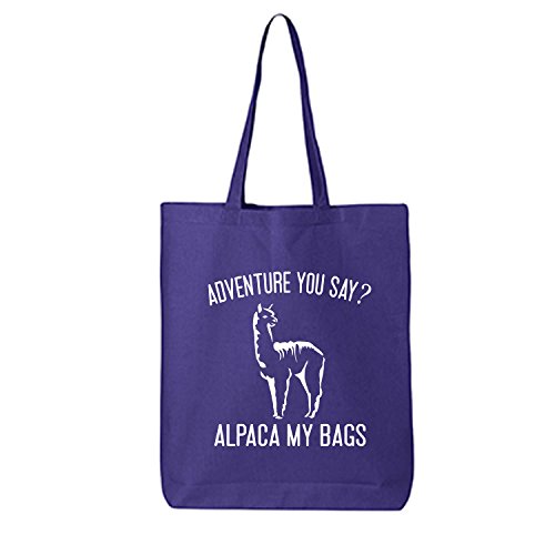 Product Description This cotton canvas tote bag features "Adventure You Say? Alpaca My Bags" on the front. 15" Wide x 16" High x 3" Deep with 20" handles. Printed in the USA on an imported bag. 0