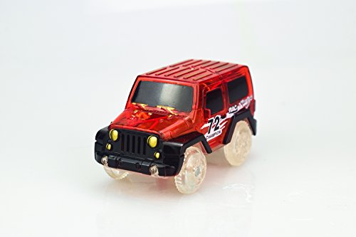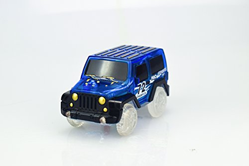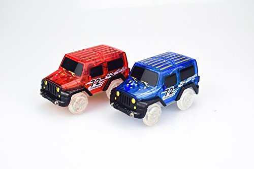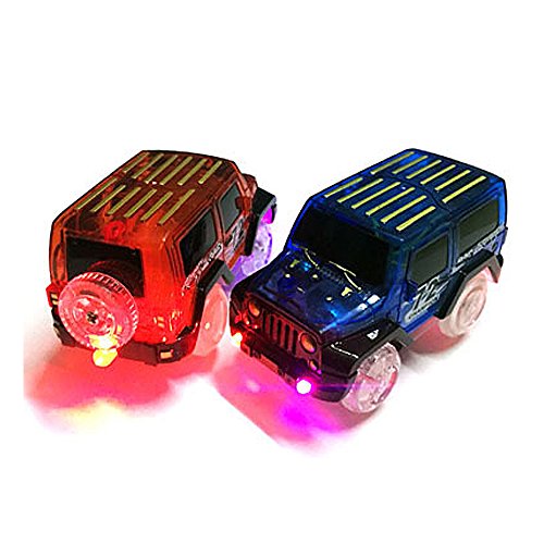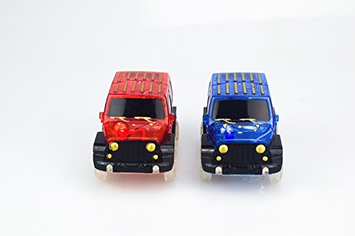 Feature: Cool cars that includes 2 toy racing cars. Each toy racing car with 3 LED lights that includes two headlights and and one black light. Easy to use that you just need to press button at the top of the vehicle, the car will shine with led lights. Funny: you will find much fun in the evening for its light. Each car requires 1 AAA batteries, not included.