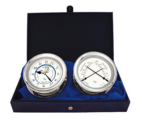 Studio : Master-Mariner Publisher : Master-Mariner Product Description As advertised in the following publications: ? Sail Magazine ? Yachting Magazine ? Florida Boating ? 48Degrees North Magazine ? Latitude 38 ? Sailing ? Gulf Coast Magazine ~ Master-Mariner is pleased to present top-quality nautical-instrument gift sets at an affordable price. If you have ever considered buying a pair of brass instruments for your boat, office or home only to be startled by how much a single nautical clock in a brass case costs, the Master Mariner Gift Set Collection will come as a welcome change of pace. ~ We at Master-Mariner have been selling clocks and weather instruments to the marine industry for over forty years and have seen how traditional methods of design and distribution have not kept pace with the means to keep prices affordable. In response we have applied several state of the art processes and unique design resulting in 6 luxury Gift Sets. As boat owners ourselves, we are sympathetic to our fellow shipmates' complaints that marine instruments are not priced for the average boater. Introducing the Master-Mariner Gift Set Collection! ~ Find all six on Amazon! ~ ? Designed and Tested in the United Kingdom ? Metal cases of 430 Stainless Steel .70" thickness ? Refractory PVD Nitride / Vacuum Metalized Lifetime Mirror Finish ? Barigo GMBH Barometer Mechanisms ? Trintec Brand Tide/Time Mechanisms ? German Thermometer and Hygrometers Mechanisms ? 4-mm beveled glass lenses ? Suitable for indoor or sheltered outdoor use ? Up to a hefty 22 ounces each x 5 7/8" diameter each instrument 0