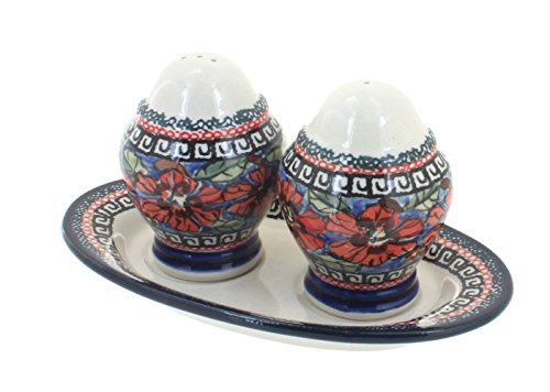 Polish Pottery Jungle Flower Salt & Pepper with Dish