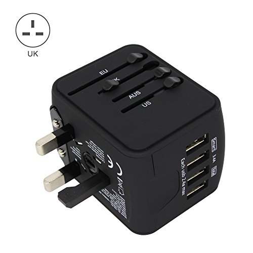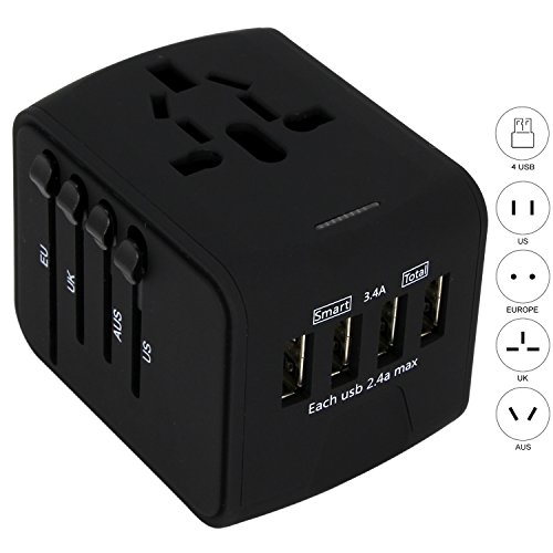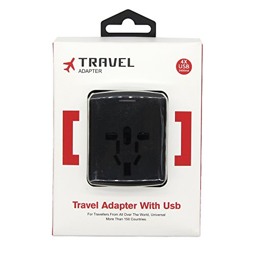 Jollyfit International Universal Travel Adapter 4 USB Ports 2.4A Charger AC Socket Power Wall Plug US UK AU EU Worldwide 150 Countries with Safe Fuse for Europe USA France Italy (Black 4 USB)