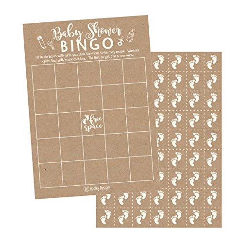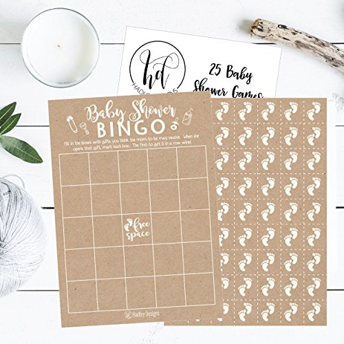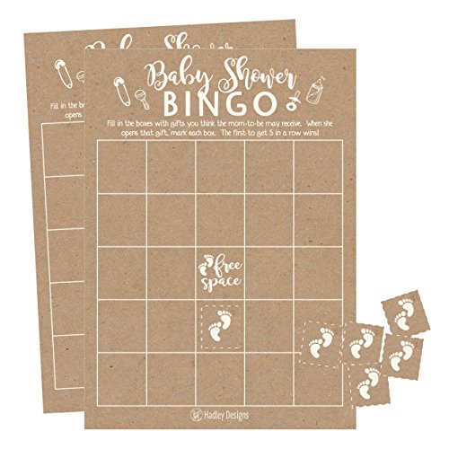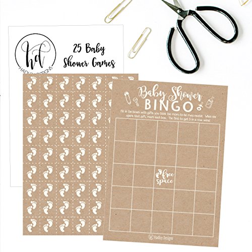 25 Rustic Kraft Bingo Game Cards For Baby Shower, Bulk Blank Bingo Squares, PLUS 25 Pack of Baby Feet Game Chips, Funny Baby Party Ideas and Supplies For Girl or Boy, Cute Kids Woodland Paper Pattern