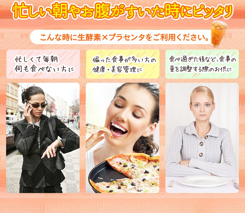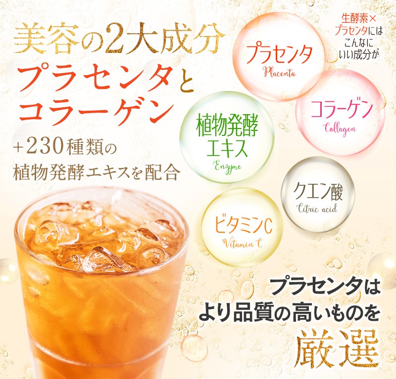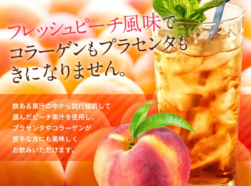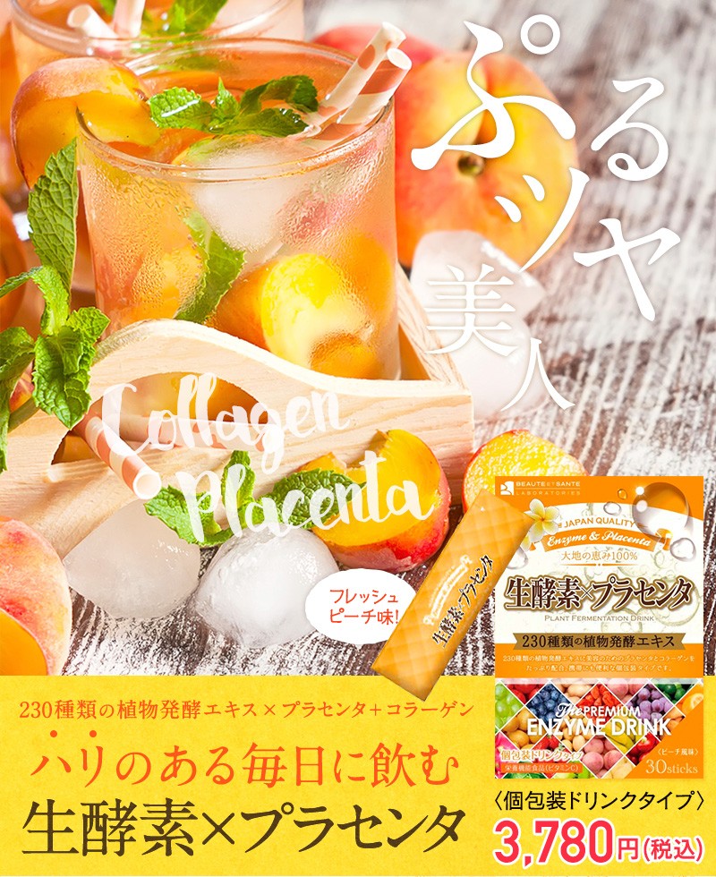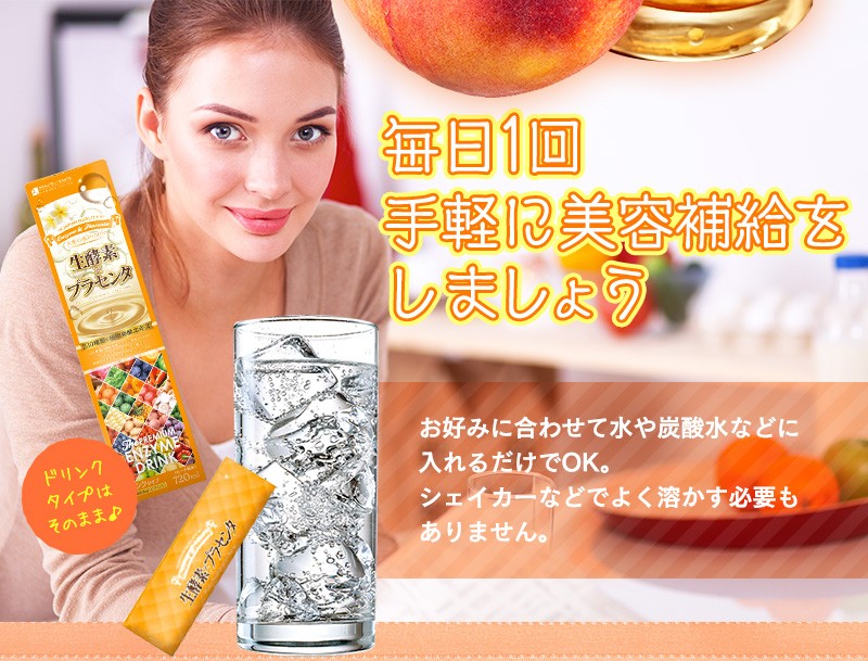 キレイな毎日をサポートする為に230種類の“植物発酵エキス”と美容の味方、“プラセンタエキス”と“コラーゲン”をギュッと詰め込みました。 美容や健康管理の為に美味しく簡単にたっぷりのプラセンタやコラーゲン、植物発酵エキスを補給できます。 味しいピーチ風味のドリンクです。持ち運びに便利な個包装です。