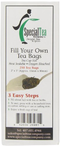 -. Binding : Grocery -. Brand : Special Tea Company -. EAN : 0852659269815 -. Feature : Fill about half full with tea or herbs / To seal, press with a household iron on cotton setting or use a curling iron / Enjoy a fresh cup of tea -. Label : Special Tea Company -. Manufacturer : Special Tea Company -. Model : 852659269815 -. NumberOfItems : 1 -. PackageQuantity : 1 -. ProductGroup : Grocery -. ProductTypeName : GROCERY -. PublicationDate : 2012-11-15 -. Publisher : Special Tea Company -. Studio : Special Tea Company -. Title : Special Tea Company Empty Tea Bags, 2 Inch x 3 Inch, 250 Count -. UPC : 852659269815