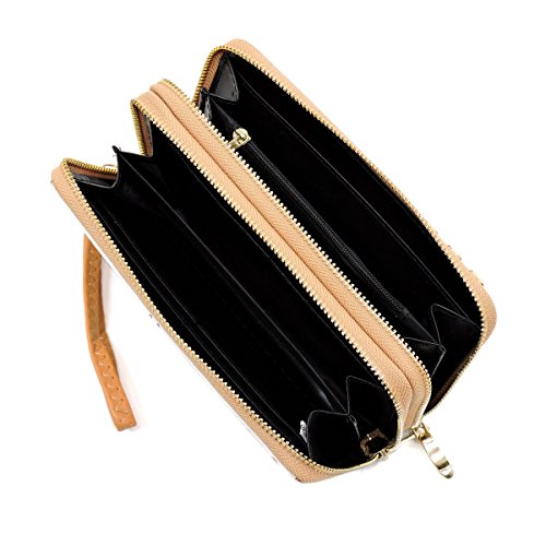 -. Feature : Faux Vegan Leather & Gold-tone hardware / Zip Around Closure / Interior fully lined / 1 inner zipper pocket , inner slip pockets and card slots / Detachable wrist strap
