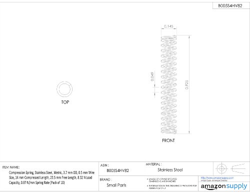 Compression Spring, Stainless Steel, Metric, 3.7 mm OD, 0.5 mm Wire Size, 7.11 mm Compressed Length, 11.5 mm Free Length, 8.32 N Load Capacity, 1.9 N/mm Spring Rate (Pack of 10)