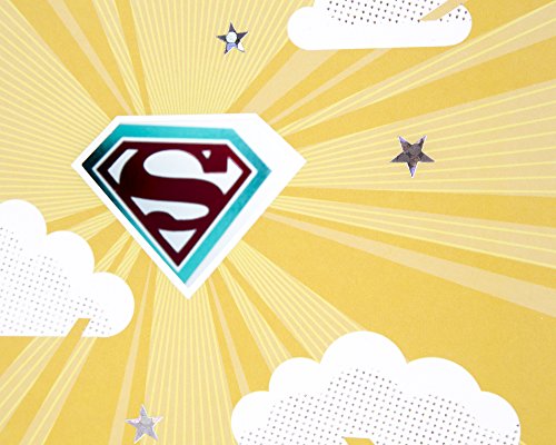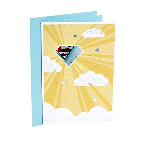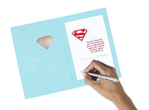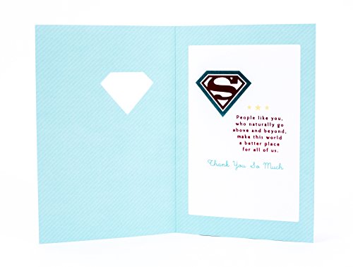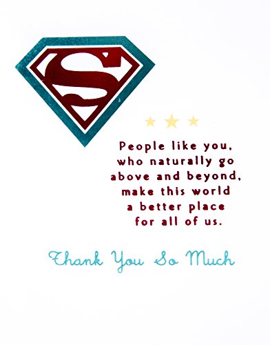 Studio : Hallmark Marketing Company, LLC (Office) Publisher : Hallmark Marketing Company, LLC (Office) Binding : Office Product Product Description Send a heartfelt note of gratitude to a special person with this card featuring a Superman emblem with radiating beams in a gold cloud- and star-filled sky. The message on the front of the card reads, "S." Open the card to reveal the inside message, "People like you, who naturally go above and beyond, make this world a better place for all of us. Thank You So Much " The card measures 8.3 inches long by 5.8 inches wide made with high quality cardstock paper; an envelope is included. All Hallmark cards are made with paper from well-managed forests. Hallmark was founded in 1910 when 18-year-old J.C. Hall arrived in Kansas City, Missouri, with a couple of shoeboxes of postcards under his arm and the American dream in his heart. Hallmark greeting cards are sold online and in nearly 40,000 retail stores across the globe and people continue to recognize the iconic Hallmark brand as "the very best." 0