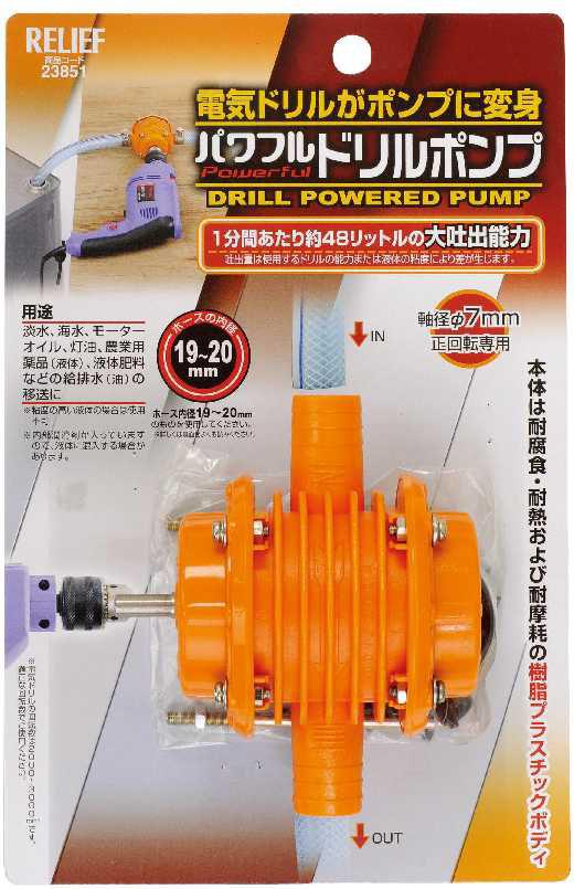 | 仕様 | 接続可能ホース:内径φ19~20mm(工業用耐圧ホース) 吐き出し能力:水平時1分間あたり約48L(2000min-1・電気ドリル使用時) 吸い上げ可能距離:半径3m以内・高さ2m以内 吐き出し可能距離:半径15m以内・高さ15m以内 使用可能電気ドリル:回転数2000~3000min-1・チャック径7mm以上 |