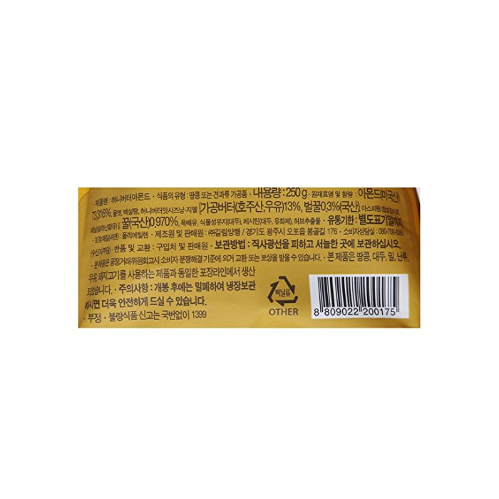 원재료:아몬드(미국산)73.316%고, 수 엿,백설탕,벌꿀 버터 향 seasoning - lunge《스》[가공 버터(오스트레일리아산,우유)13%고, 벌꿀0.3%(한국산)고, 아스 PAL《데무》]고, 벌꿀(한국산)0.970%고, 오크《베유》,식물성 기름지(대두)고, 레시틴(대두)고, 허브 엑기스