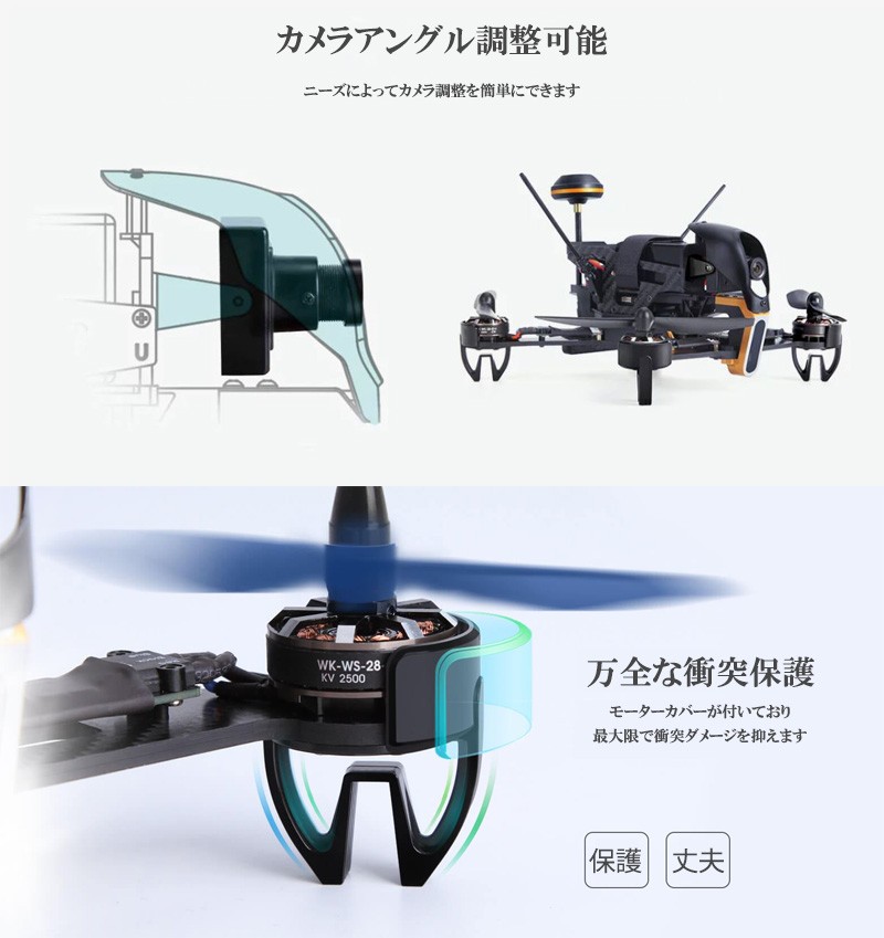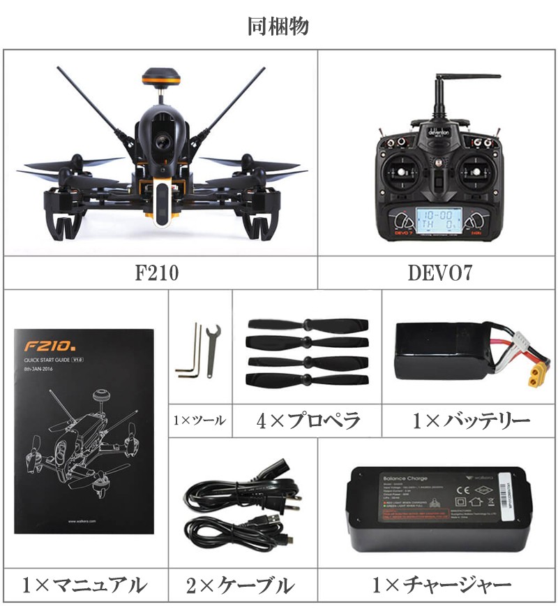 | 構成 | F210 3D Edition x 1 700TVL FPVカメラ x 1 カメラカバー(黒、オレンジ、青) x 1 5.8G Video TX5824 x 1 OSD x 1 バッテリー 14.8V 1300mAh 40C 4S Li-Po x 1 急速充電器 x 1 2Dプロペラ(4 x 黒,4 xオレンジ) x 1 3Dプロペラ(青) x 1 3Dプロペラキャップ x 1 ツールセット x 1 オリジナル簡易日本語説明書×1 |