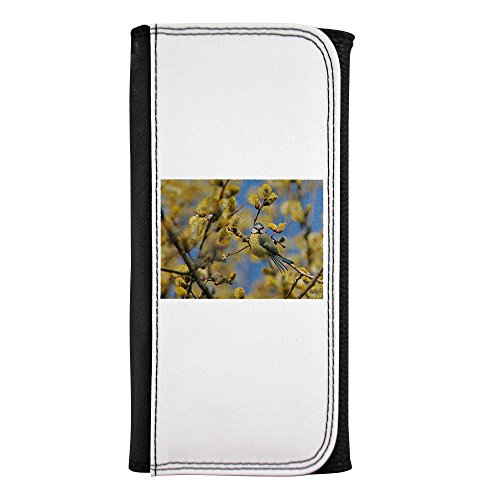 Bird perching on a twig among blooming yellow flowers leatherette wallet!