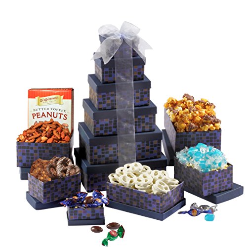-. Feature : Great Holiday Gift / Perfect gift for family and friends, or as a corporate office gift. / Gift tower includes: Chocolate Covered Hazelnuts & Almonds (7pc), Mint Flavored Sweets (15pc), Brownie Brittle - Salted Caramel (1oz), Milk Chocolate Bavarian Pretzels (2pc), Chocolate Drizzled Caramel Popcorn (4oz), Butter Toffee Peanuts (3oz), Spicy Cajun Mix (4oz) & Yogurt Pretzels (5oz) / GIFT TOWER DIMENSIONS: 7" x 5" x 16" / Kosher Certified OK D. Giving a kosher gift ensures that all recipients can enjoy and partake in your gift.