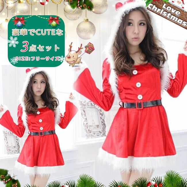 サンタ コスプレ レディース 長袖 フード付き フェイクファー ボレロ ワンピース セクシー クリスマス コスチューム 衣装 サンタコス 仮装 変装 大人 服 セットアップ かわいい サンタクロース パーティーグッズ イベント用品 余興 xmas Christmas cos 女性用