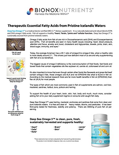 -> Our Omega 3 fish oil supplement is free of extraneous fillers, binders, artificial ingredients, potentially harmful preservatives, gluten or GMOs. It is free and clear of heavy metals, dioxins, and pesticides. Deep Sea-Omega 3TM is medical doctor certified (MD-C) TM and has been reviewed for safety, effectiveness, properly dosed and pharmacokinetics.