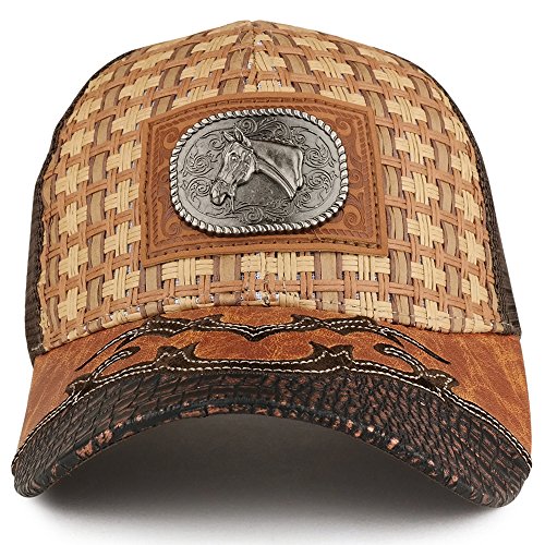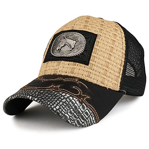-. Binding : Apparel -. Brand : Trendy Apparel Shop -. Department : mens -. Feature : Metallic horse emblem badge on front patch / Matching mesh adjustable snapback closure / Mesh and straw crown hat / PU Leather design on stiff and pre-curved bill / One Size Fits Most -. ProductGroup : Apparel -. ProductTypeName : HAT -. Title : Trendy Apparel Shop Straw Design Metallic Horse Logo Badge Trucker Mesh Adjustable Baseball Cap