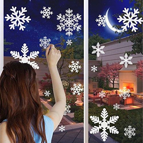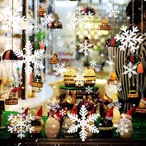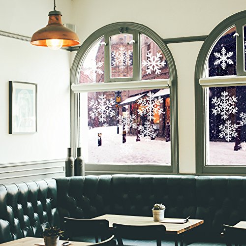 6 Sheet of snowflake stickers set: each sheet has 27 pieces of snowflake clings, 162pieces Snowflakes in total; 3 Patterns snowflakes with various sizes. White, and the edge and interval of them is transparent.