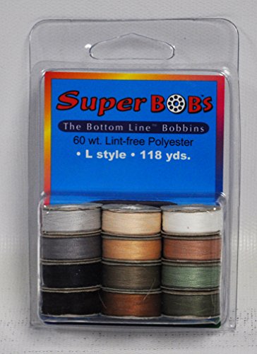 -. Feature : SuperBOBs. Neutral Assortment. Cardboard side bobbins. / 60wt polyester thread on cardboard bobbins. 118 yds per bobbin. 12 bobbins in package. L style bobbins will fit in most home machines. / The Bottom Line colors included in package: 609 Dark Blue, 613 Sage, 614 Light Green, 617 Taupe, 618 Medium Brown, 619 Tan, 620 Cream, 622 Gray, 623 Silber, 624 Natural White, 625 Black, 650 Champagne.