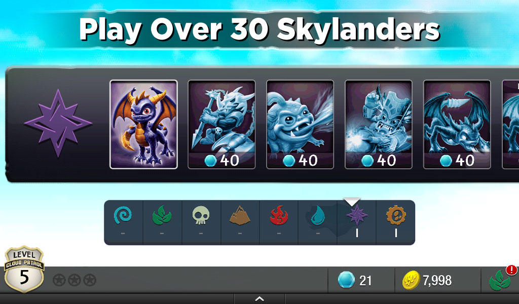 - Feature : Tap to shoot or slide your finger across targets creating amazing knock out combos / Score the highest combo per area to get more points and collect more loot. / Complete goals to level up and earn gems to unlock more Skylanders / Use tons of magic item boosts to help you power through your adventure. / Dominate the leaderboards and show your friends who rules the skies!