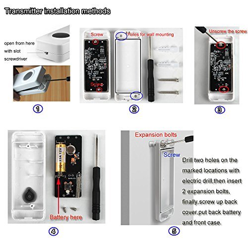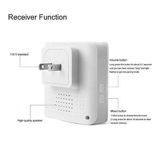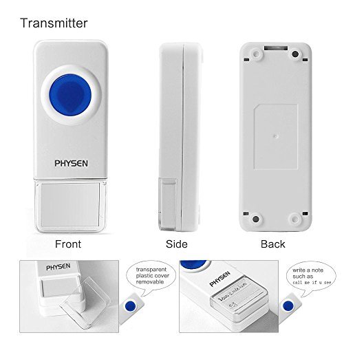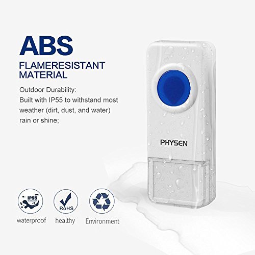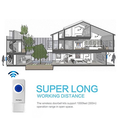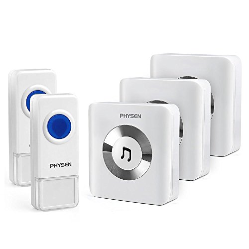 -. Feature : PHYSEN wireless doorbell is simple and stylish.2 remote push button and 3 plug-in receivers kit is very popular for department,large office,building of multifloor and etc. / Doorbell can work within 900 feet in open area.Generally,it can work within 200-700 feet through the metal security doors and walls depending on the specific using environment / Remote push button is waterproof can accept for indoor or outdoor using environment,No matter is rain or snow weather / adjustable volume levels from 30dB to 110dB and over 50 different ring tones with backward button and forward button for you easily to select the favorite music / Easy install:just plug the receiver into outlet and use double-side adhesive tape at the back of the transmitter,also you can use the screw to install it.CE, FCC, RoHS certified