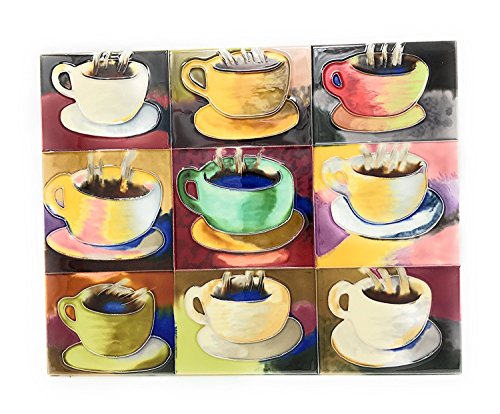 - The tile art features 9 Images of assorted color Coffee Cups with brew.