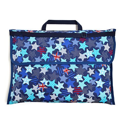 爽やかなブルーに彩られた色んな星たち。ストライプや水玉などグラフィカルなパターンでコラージュされているよ。夜空のようなネイビーカラーとの相性もばっちり。