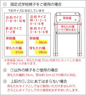 1. 園・学校の指定【背もたれ】【ざぶとん】タイプ どちらにも対応する、便利な2WAY仕様! 椅子の背もたれに掛けて収納する【背もたれタイプ】、 椅子の上に敷いて収納する【ざぶとんタイプ】も これひとつでOK!園児~高学年向けサイズ。
