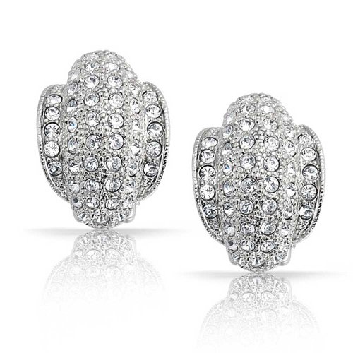 To acquire that old Hollywood, screen siren look, choose these wide, half hoop, brass clip on earrings for non - pierced ears. Luminous lines of pave crystal create a striking, 3 dimensional effect for that extra pop of sparkle. Lovely for April birthday.