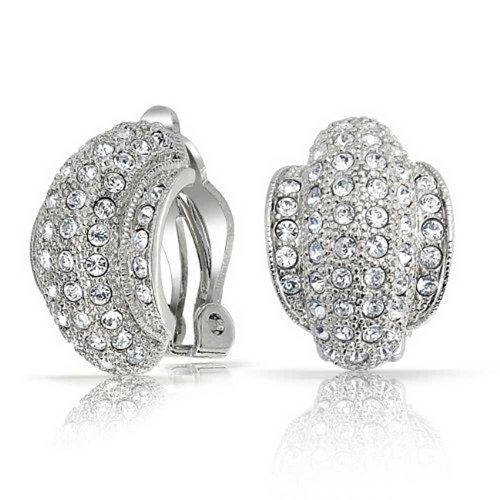 Add some chic, vintage Hollywood style jewelry to your wardrobe by purchasing our crystal half hoop clip on earrings. These clip on earrings are rhodium plated with six rows of crystals. These fashion clip on earrings are made from quality materials and made specifically for non pierced ears. These 6 row crystal hoop clip on earrings are perfect for that special formal celebration. These rhodium plated base metal clip on earrings will fit comfortably on your ear and are light weight. These crystal half hoop clip on earrings are a must have so order yours today.Feature