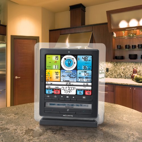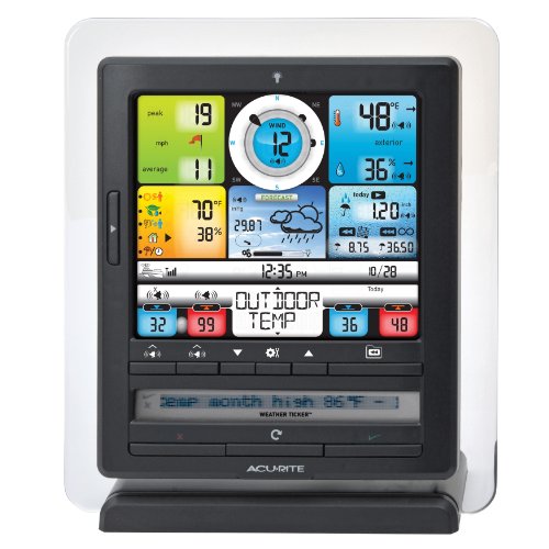 Plan the day with confidence with your own weather and weather prediction information - pinpoint accuracy right from your own backyard. The AcuRite Professional Weather Station uses patented Self-Calibrating Technology to provide your personal forecast of 12 to 24 hour weather conditions. Self-Calibrating Forecasting is generated from weather data measured by a sensor in your yard - giving you the most accurate forecast available for your exact location. PC Connect feature transmits your weather data to your Windows PC and enables you to use AcuLink software for remote monitoring via the internet or a smartphone. The illuminated color LCD display includes indoor/outdoor temperature and humidity, wind speed/direction/chill, rain, barometric pressure, clock, calendar and more. Personalize the Weather Ticker to stream the information you want. Custom programmable alarms will alert you when weather conditions change. Display stands upright for tabletop use or is wall-mountable. The patent-pending wireless outdoor sensor features 5 different technologies in one easy-to-mount unit: thermometer, hygrometer, wind speed anemometer, wind direction vane and a self-emptying rainfall collector cup. Weather station display is powered by a 4.5V power adapter (included; recommended for optimal display color) or 6 AA alkaline batteries (optional; not included). Wireless sensor is powered by 4 AA alkaline or lithium batteries (not included). Lithium batteries recommended for use in outdoor sensor for temperatures below –4 degrees Fahrenheit (-20 degrees Celsius). One-year limited warranty. It's more than accurate, it's AcuRite.