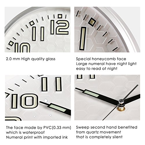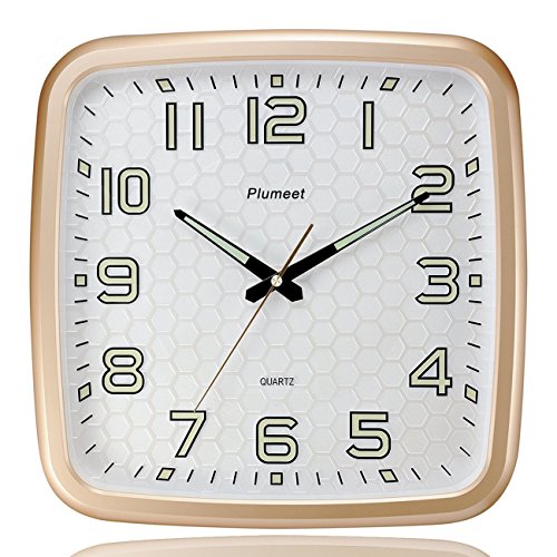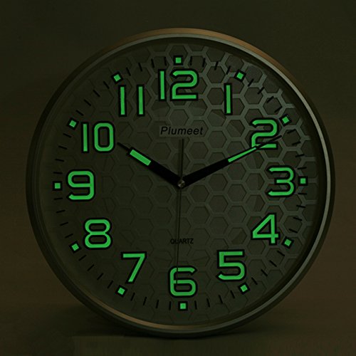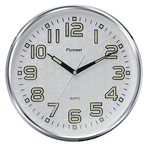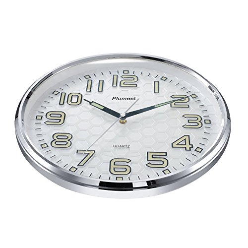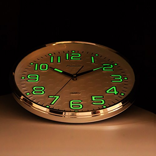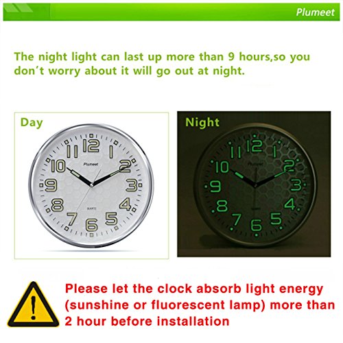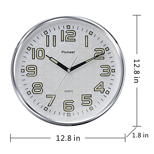 Plumeet wall clock advantage: super quiet & non-ticking at night with night lights function, large enough for easily to see and read 13 inch diameter round frame.