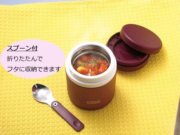 | 保温・保冷どちらでもOK!熱々のスープやシチュー、冷たいデザートまで幅広く使えます。持ち運びに便利なひとり分にピッタリなサイズ。嬉しいスプーン付き!折りたたんでフタの中に入れられます。 |