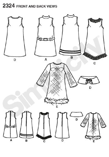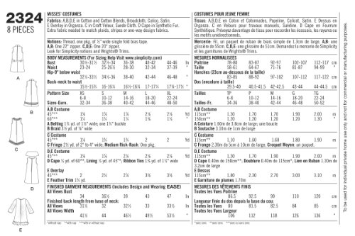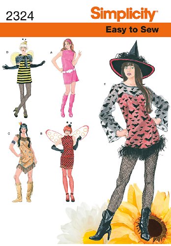 -. Feature : Misses' easy to sew costumes in size a (xs-s-m-l-xl), simplicity pattern 2324 / Number of looks included:5 / Designed and manufactured in theusa / Sested Fabrics: A,B,D,E in Cotton and Cotton Blends, Broadcloth, Calico, Satin; E Overlay in Organza; C in Craft Velour, Suede Cloth; D Cape in Synthetic Fur; Extra fabric needed to match plaids, stripes or one-way design fabrics
