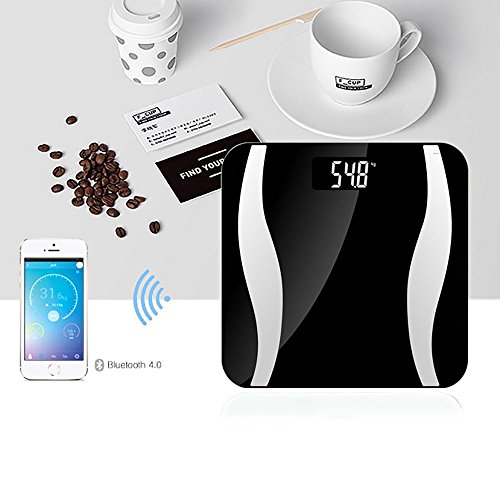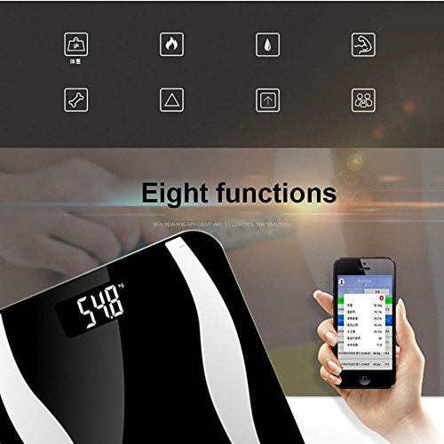 -. Feature : Smart Technology tracks Body Weight, Body Fat, Body Water, Muscle Mass, BMI(body mass index), BMR(KCAL), Bone Mass, Visceral Fat and transmits data to your phone. / Via Bluetooth technology, the scale seamlessly uploads the measurements to the corresponding App that can be downloaded on iOS or Android smartphone or tablet. App tracks and records every measurement; Has table, list, and graph display options; Can store information for up to 8 users / Data History and View Store, track, compare and share your data at your finger tip. View the data in list, table and graph view. Monitor weight loss progress by comparing with goal. / Operation and self-protection: On the first use, please insert the included 3*AAA batteries and switch the button to kg/lb in the top left corner to finish setting. After 30 seconds of no operation will automatically power off. If the weight overloads it will auto-power off to avoid damage the scale. / Warranty: 100% Brand New and High quality from ETTG ,sold by ETTG ONLY! ETTG offers 12 months Warranty and 30 days free exchange.