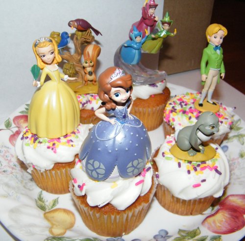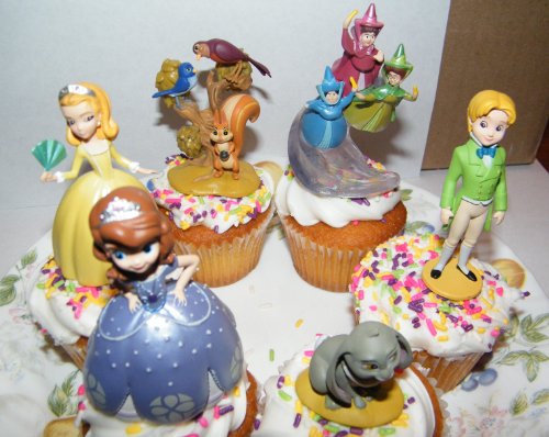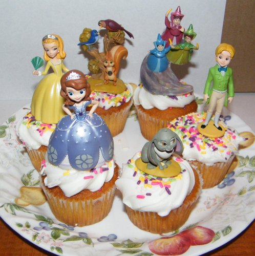 This listing is for 6 colorful cake/cupcake toppers from the popular new Disney show Princess Sophia the First! These nicely detailed figures will help make your cake a big hit with any Disney fan. You get all the popular characters including Princess Sophia the First in a light blue ball gown with a crown tiara, Princess Amber in a yellow ball gown, Prince James, Clover the Rabbit, her 3 woodland friends Mia the Bluebird, Poppy the Robin and Whatnot the squirrel and lastly the 3 fairies Flora, Fauna and Merryweather!