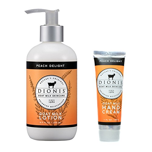 - Two item set that includes one 8.5 oz Goat Milk Body Lotion and one 1 oz tube of Goat Milk Hand Cream in "Peach Delight" scent.