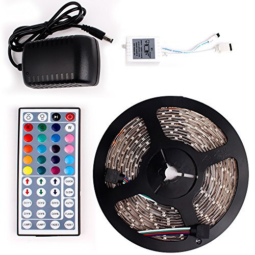 Solarphy 16.4ft (5m) SMD 3528 RGB LED Strip Light Waterproof 300 LEDS Flexible Color Changing RGB LED Light Strip Kit with 12V Power Supply & 44 Keys Remote Controller For Home Party, Xmas Decoration