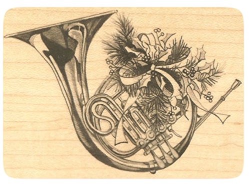 -. Title : {Single Count} Unique & Custom (4" by 3 1/2" Inches) "Christmas Holly, Ribbon & French Horn" Rectangle Shaped Genuine Wood Mounted Rubber Inking Stamp