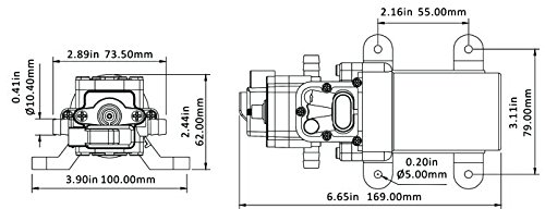 -. Feature : On-demand, automatic water pump for small boats, campers and / Built-in 35 PSI(2.4 BAR) pressure switch for automatic stop/start / Self-P.R.Iming allows it to be mounted above tank; able to run dry / Quiet operation; 3/8-inch hose barb ports / 1.2 gallons per minute (4.3 liters per minute); 2.0 Max Amps