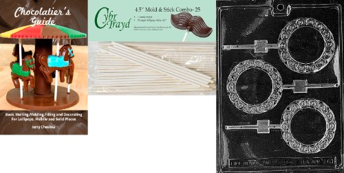 Cybrtrayd 'Plain Round Fancy Border Lolly' Miscellaneous Chocolate Candy Mold with 25 4.5-Inch Lollipop Sticks and Chocolatier's Guide
