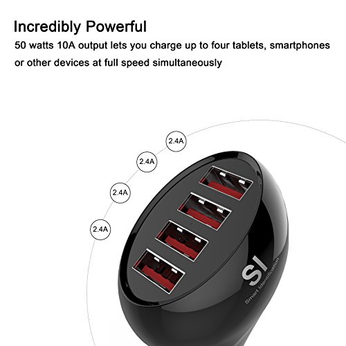 Car Charger, Vogek 50W 10A 4-Port USB Car Charger with Smart Identification for iPhone 7 / 6s / Plus, iPad Pro / Air 2 / mini, Galaxy S8 /S7 / S6 / Edge / Plus, Note 5 / 4 - Black