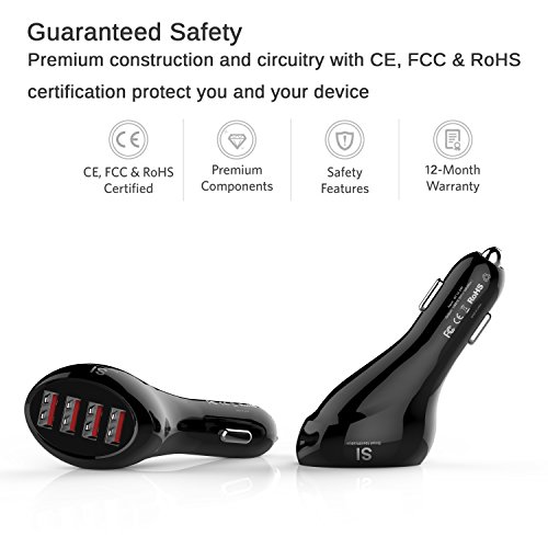 [Quality Construction]: 4-port car charger is made of top-grade plastic, circuitry. Special designed cowling to keep temperatures low thus ensuring stable working conditions, a long lifespan