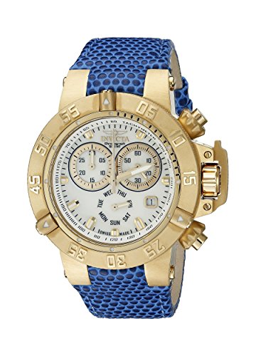 White dial with gold tone and white hands and hour markers; luminous; unidirectional 18K gold ion-plated stainless steel bezel; screw-down pushers and crown with security bar; tachymeter; flame fusion crystal; 18K gold ion-plated stainless steel case; blue leather strap with reptile design