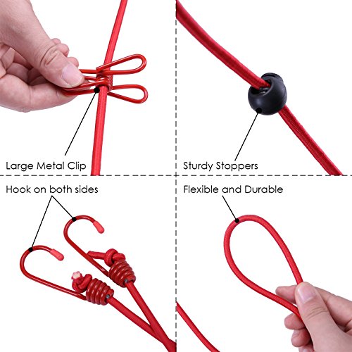 - Durable and Stretchy | Bungee cord material stretches up to 10 feet long and has 12 coated strong metal clips, coated metal end hooks allow line to be attached anywhere