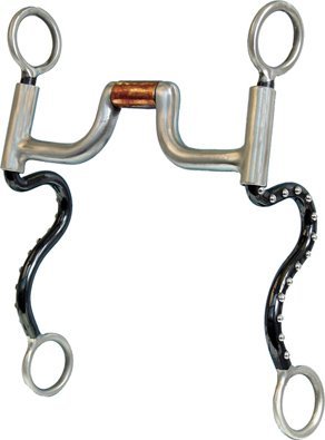 Product Description Black satin hinged port bit hinged port mouthpiece with copper roller and copper inlays 8" s shank with dots for intermediate to advanced horse (strong effect) 0