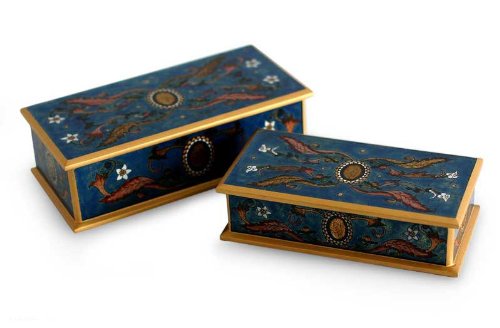 NOVICA Reverse Painted Glass Wood Jewelry Box, Blue 'Midnight Marvel' (Pair)