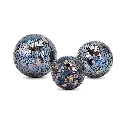 Studio : Benzara Publisher : Benzara Binding : Kitchen Product Description Artistically designed, this set of three decorative mosaic Balls are the perfect accent for modern theme interior decoration. Colorful cutout glass pattern is best to set in bowls on the table top decor. Balls made with three different sizes classily with a fine shine. Dimensions: 5x5x5, 4x4x4, 3.75x3. 75x3. 75. 0