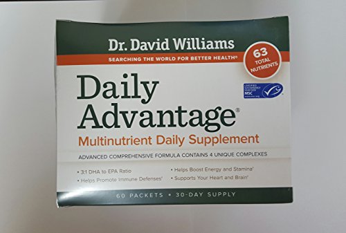 -. Binding : Health and Beauty -. Brand : Dr. David Williams -. IsAdultProduct : 0 -. Label : Williams -. Manufacturer : Williams -. PackageQuantity : 1 -. ProductGroup : Health and Beauty -. ProductTypeName : HEALTH_PERSONAL_CARE -. Publisher : Williams -. Studio : Williams -. Title : Dr. Williams' Daily Advantage Multi-Nutrient Vitamin Supplement for Boundless Energy and Total Body Wellness, 60 Packets (30-Day Supply)