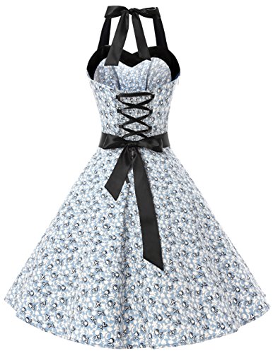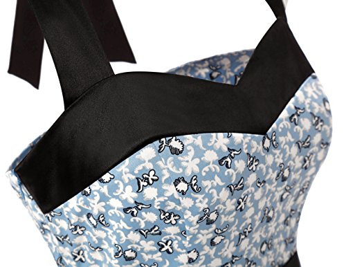 With its elegant halter neckline, form-fitting bodice, empire waist, size zipper up closure, lace up elastic back, and knee length skirt, this elegant knee length retro audery dress is worthy of celebration!